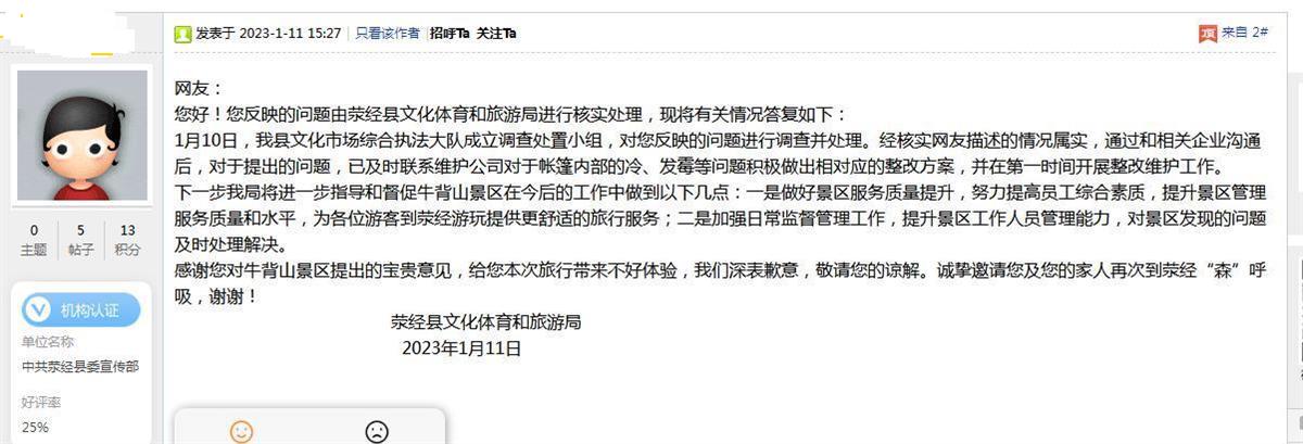 1月11日,荥经县文化体育和旅游局回复称,1月10日,荥经县文化市场综合执法大队成立调查处置小组,对反映的问题进行调查并处理,经核实网友描述的情况属实,通过和相关企业沟通后,对于提出的问题,已及时联系维护公司对于帐篷内部的冷、发霉等问题积极做出相对应的整改方案,并在第一时间开展整改维护工作。